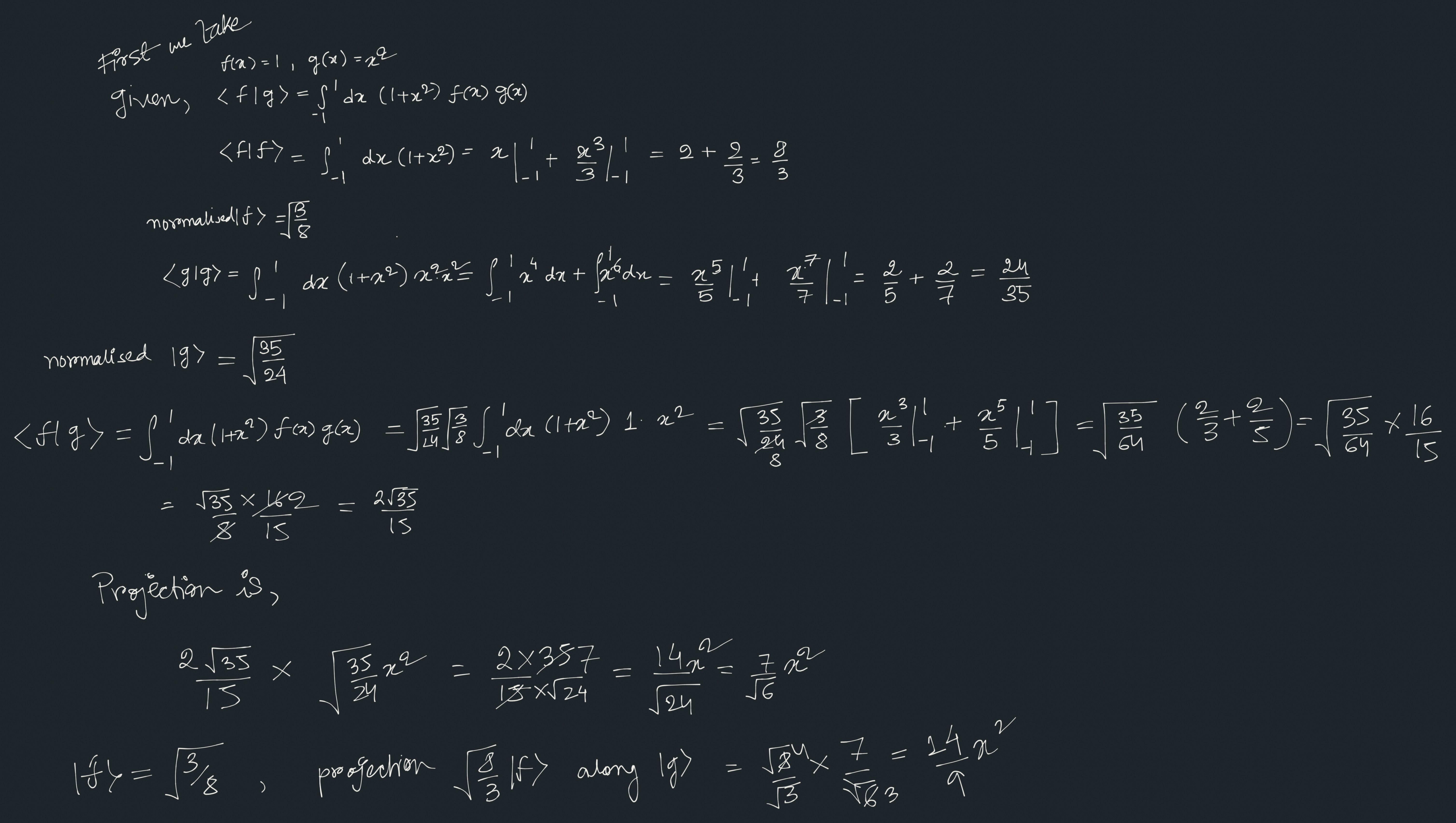 \[\langle f|g\rangle=\int_{-1} ^{1} dx \hspace{1mm} (1+x^2) \hspace{1mm} f(x) \hspace{1mm} g(x)\]