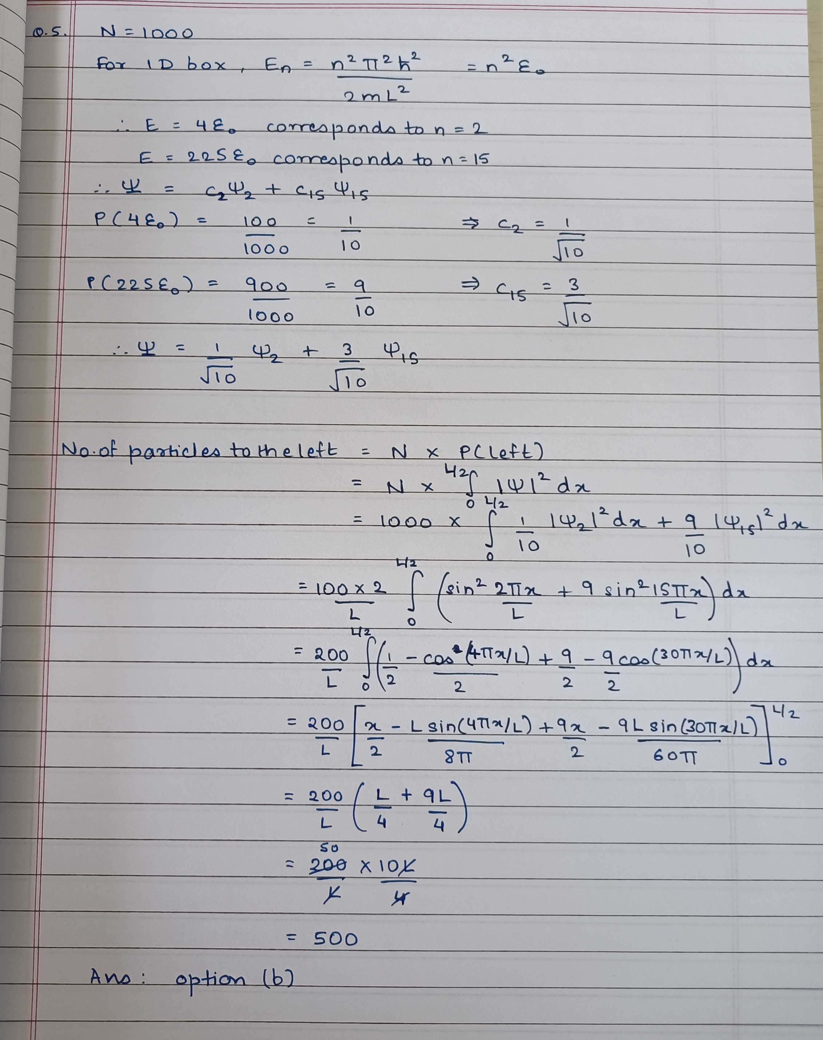 \(1000\) neutral spinless particles are confined in a one-dimensional box of length \(100 nm\). At a given instant of time, if \(100\) of these particle have energy \(4\epsilon_0\) and the remaining \(900\) have energy \(225\epsilon_0\), then the number of particles in the left half of the box will be approximately