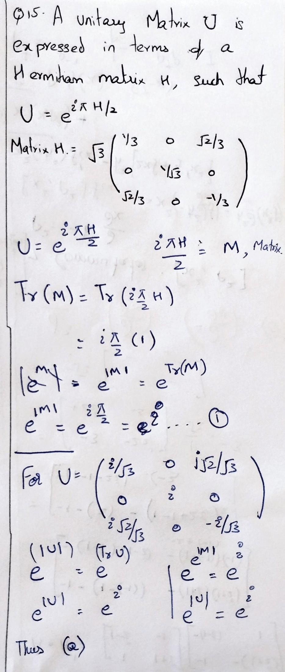 A unitary matrix \(U\) is expanded in terms of a Hermitian matrix \(H\), such that