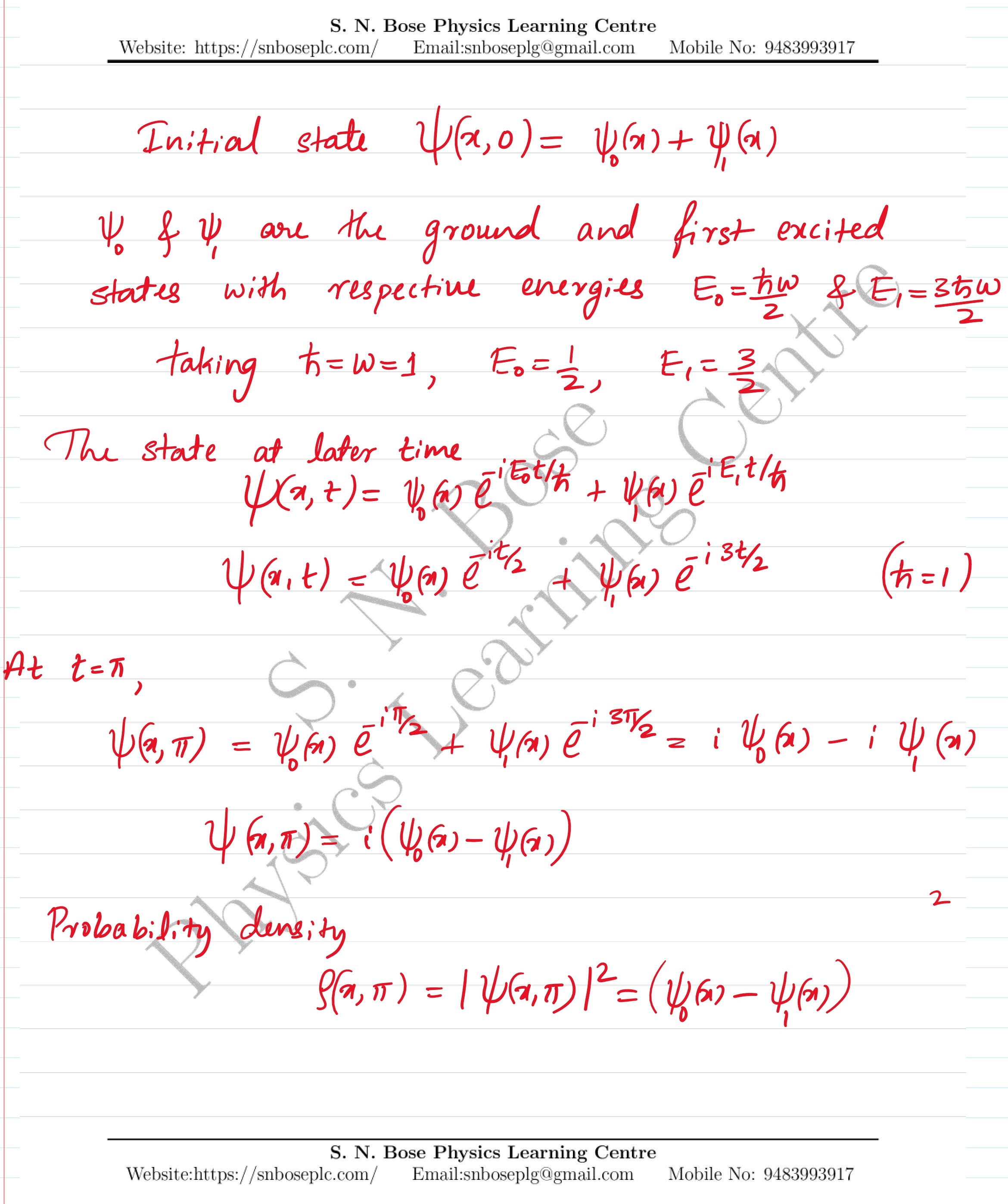 A quantum mechanical particle in a harmonic oscillator potential has the initial wavefunction \(\psi_0(x)+\psi_1(x)\), where \(\psi_0\) and \(\psi_1\) are the real wavefunctions in the ground and first excited states of the harmonic oscillator Hamiltonian. For convenience we take \(m=\hbar=\omega=1\) for the oscillator. What is the probability density of finding the particle at \(x\) at time \(t=\pi\)?