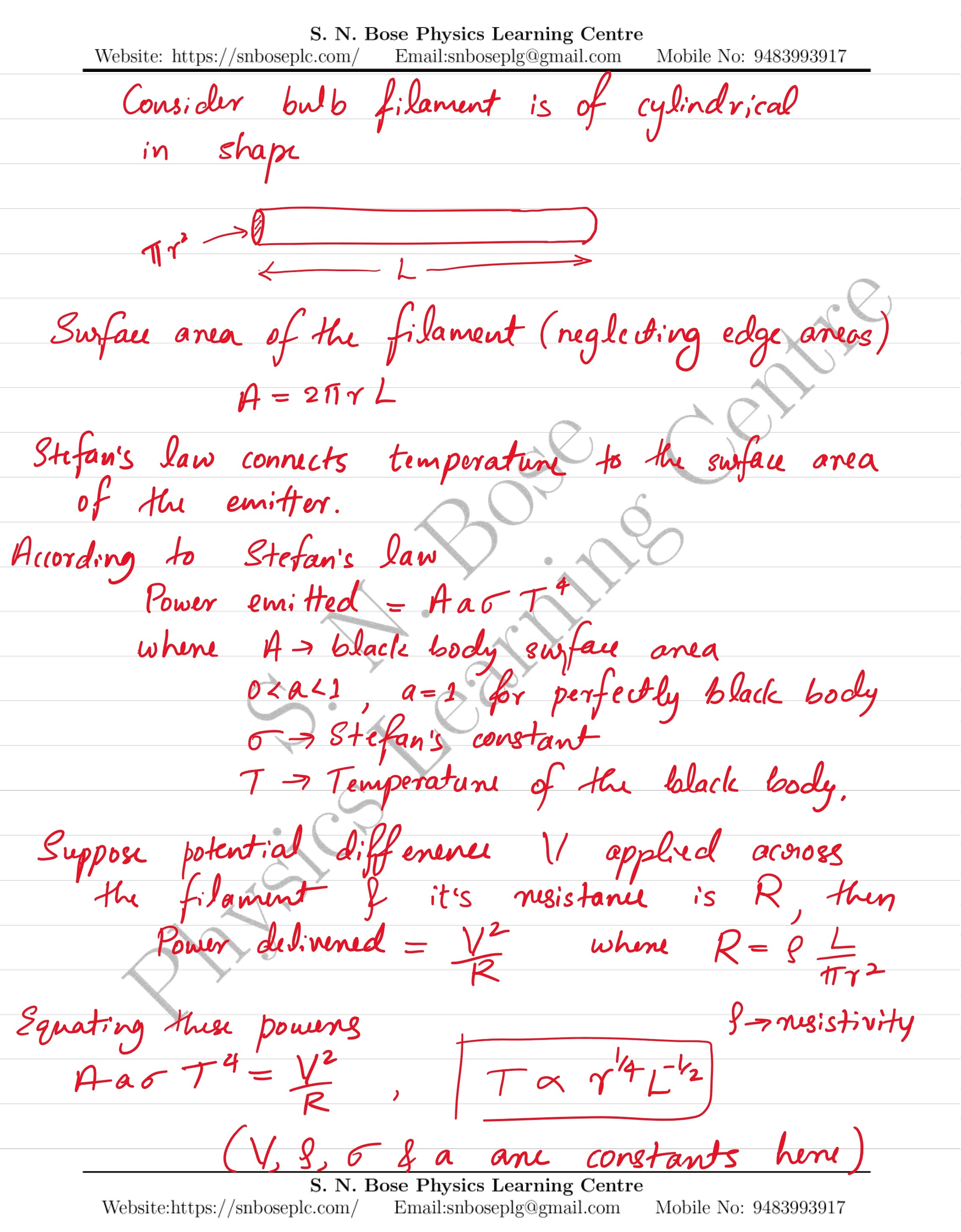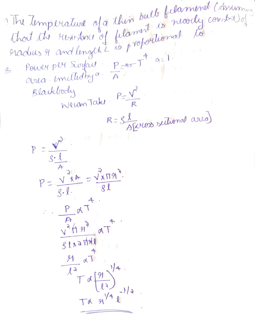 The temperature of a thin bulb filament (assuming that the resistance of the filament is nearly constant) of radius \(r\) and length \(L\) is proportional to