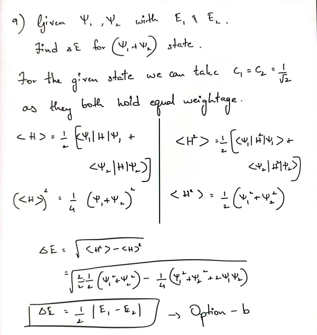 Given that \(\psi_1\) and \(\psi_2\) are eigenstates of a Hamiltonian with eigenvalues \(E_1\) and \(E_2\) respectively, what is the energy uncertainty in the state \((\psi_1+\psi_2)\)?