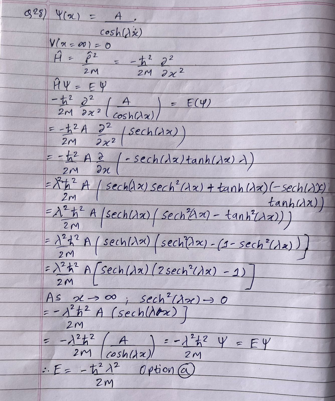 A particle of mass \(m\) moves in \(1\)-dimensional potential \(V(x)\) which vanishes at infinity. The exact ground state eigenfunction is \(\psi(x)=A\) sech \((\lambda x)\) where \(A\) and \(\lambda\) are constants. The ground state energy eigenvalue of this system is,