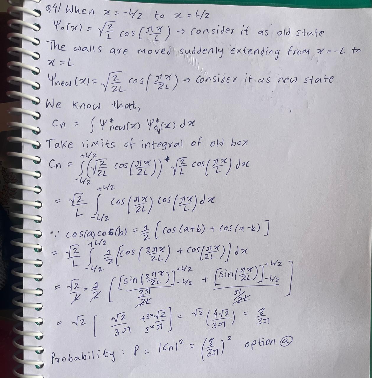 A particle of mass \(m\) is contained in a one-dimensional infinite well extending from \(x=-L/2\) to \(x=L/2\). The particle is in its ground state given by \(\psi_0(x)=\sqrt{2/L}\cos{(\pi x/L)}\). The walls of the box are moved suddenly to form a box extending from \(x=-L\) to \(x=L\). What is the probability that the particle will be in the ground state after this sudden expansion?