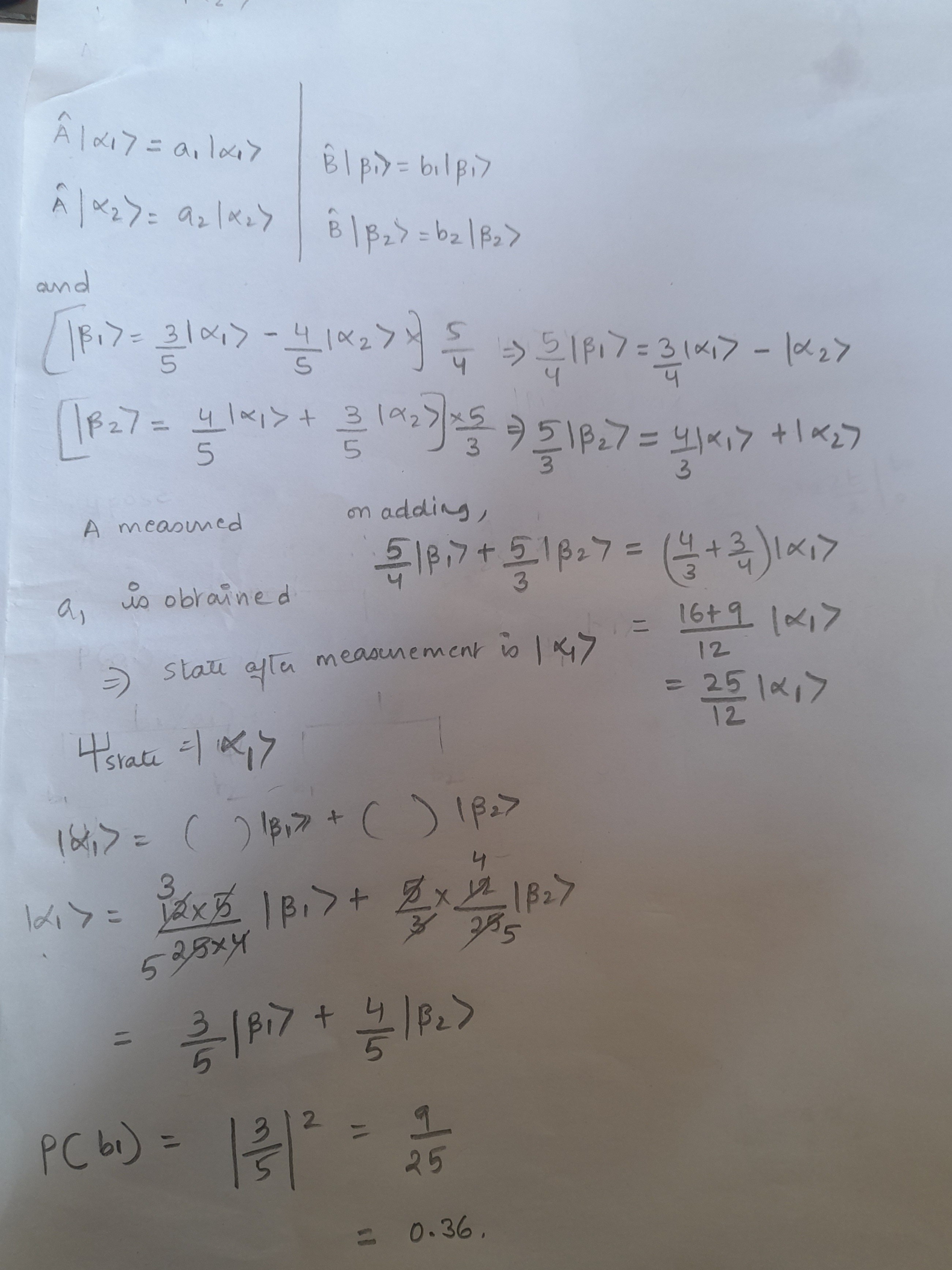 Suppose a measurement is made of the observable \(A\) and a value \(a_1\) is obtained. If the observable \(B\) is now measured, the probability of obtaining the value \(b_1\) will be