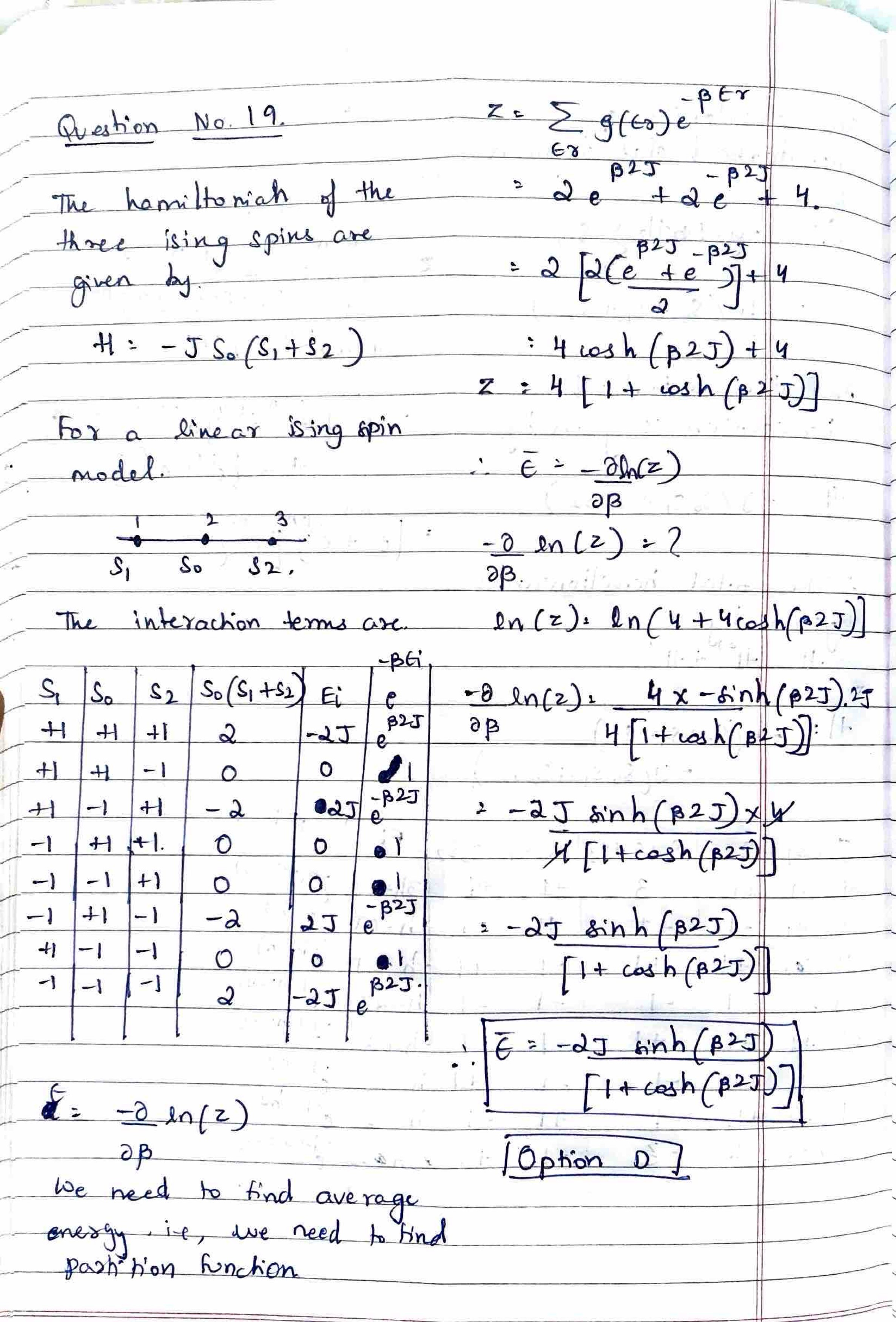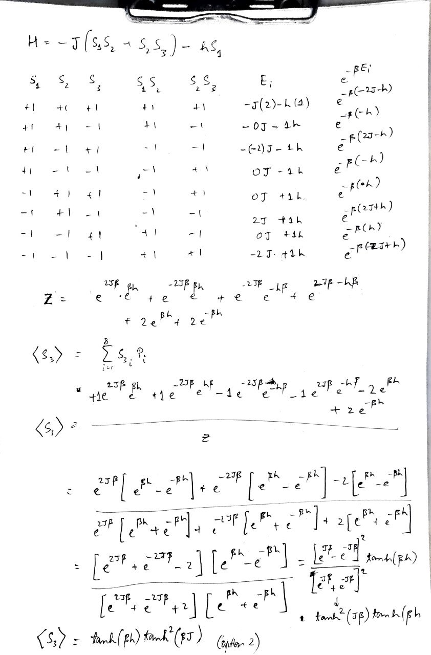 Consider three Ising spins at the vertices of a triangle which interact with each other with a ferromagnetic Ising interaction of strength \(J\). The partition function of the system at temperature \(T\) is given by
