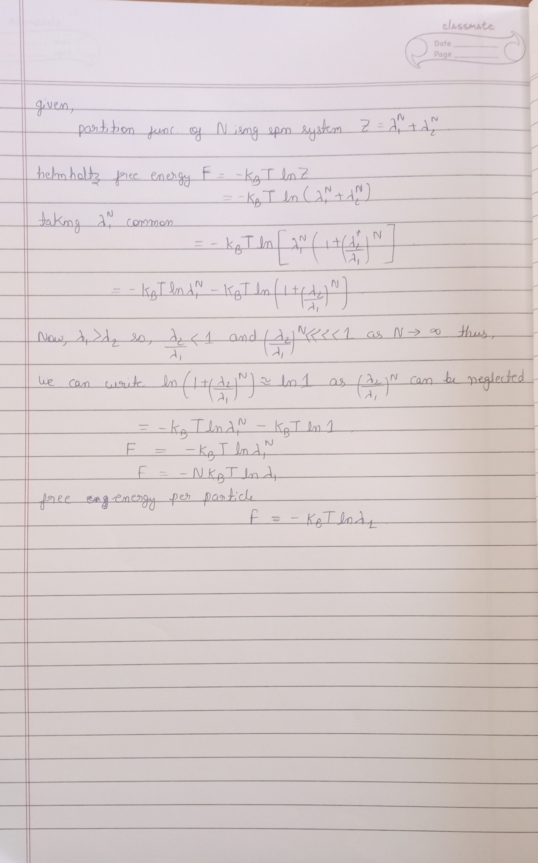 The partition function of a system of \(N\) Ising spins is \(Z=\lambda_1^N+\lambda_2^N\), where \(\lambda_1\) and \(\lambda_2\) are functions of temperature, but are independent of \(N\). If \(\lambda_1>\lambda_2\), the free energy per spin in the limit \(N\to \infty\) is