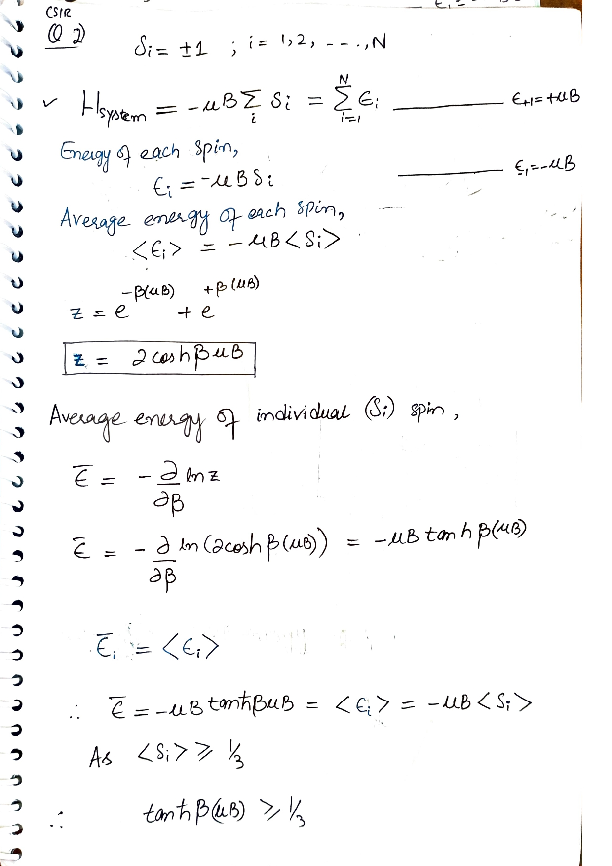 A collection \(N\) of non-interacting spins \(S_i\), \(i=1, 2, \cdots, N\), (\(S_i=\pm 1\)) is kept in an external magnetic field \(B\) at a temperature \(T\). The Hamiltonian of the system is \(H=-\mu B\sum_{i} S_i\). What should be the minimum value of \(\frac{\mu B}{k_B T}\) for which the mean value \(\langle S_i\rangle\geq \frac{1}{3}\)?