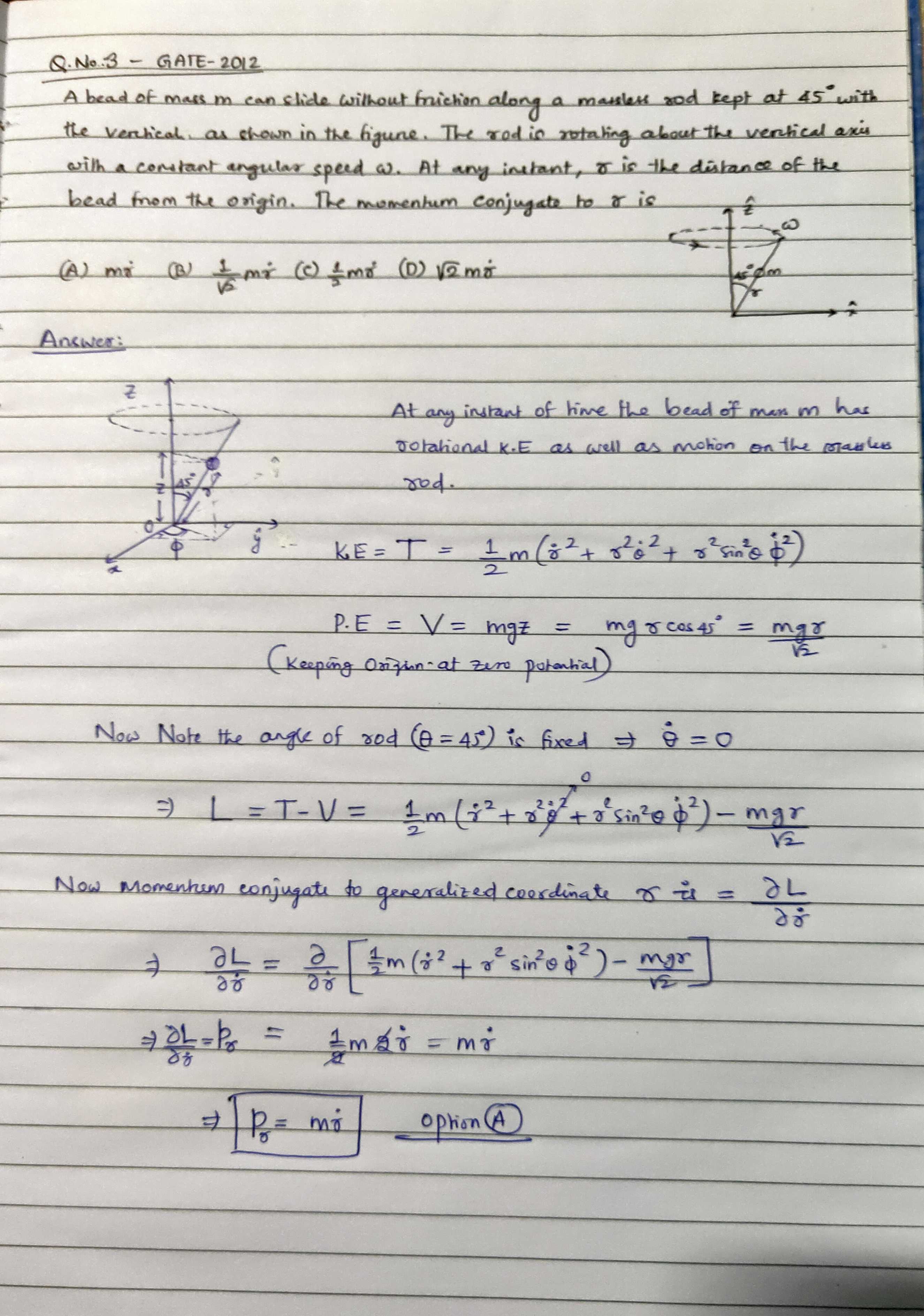 A bead of mass \(m\) can slide without friction along a massless rod kept at \(45^{\circ}\) with the vertical as shown in the figure. The rod is rotating about the vertical axis with a constant angular speed \(\omega\). At any instant, \(r\) is the distance of the bead from the origin. The momentum conjugate to \(r\) is