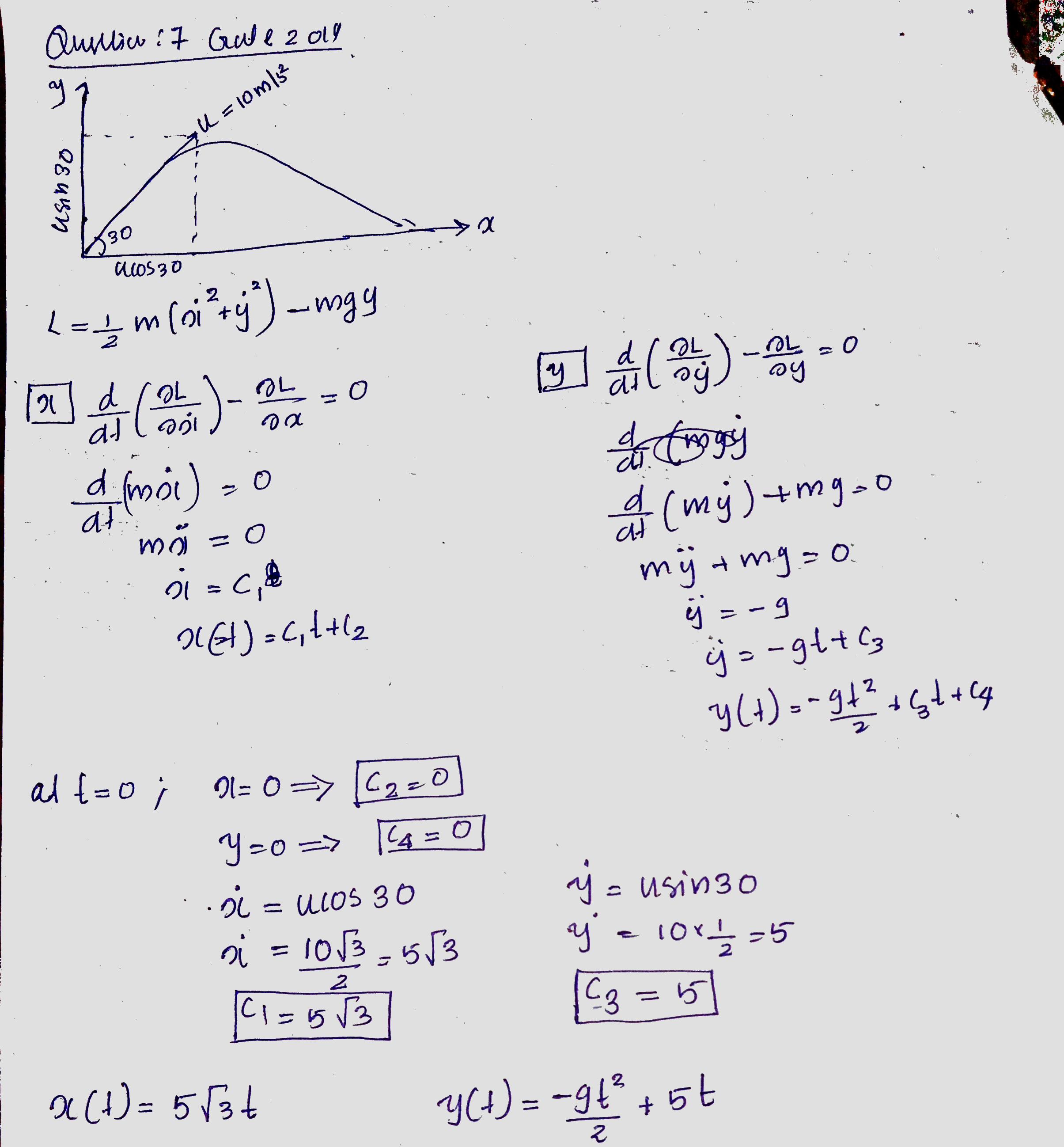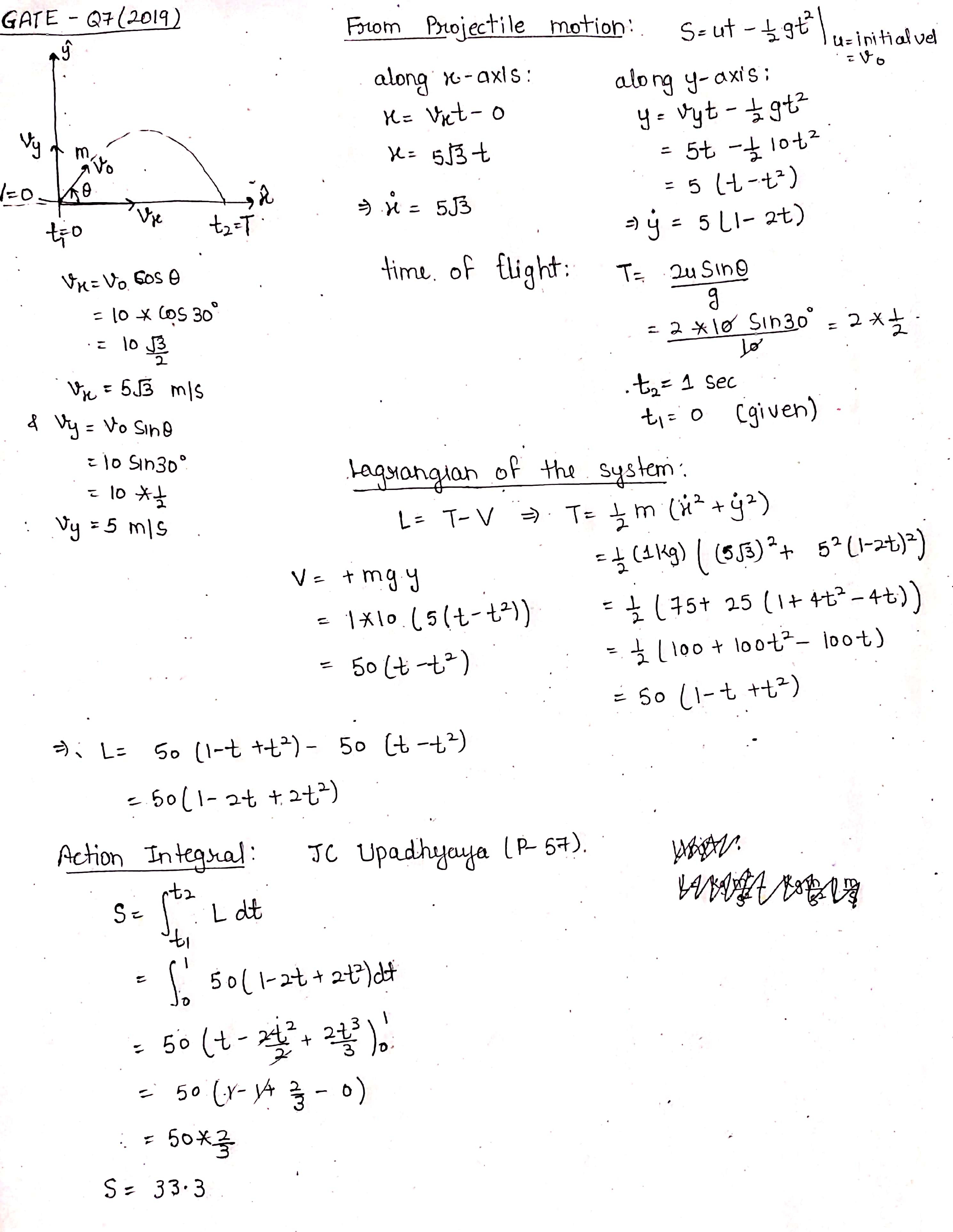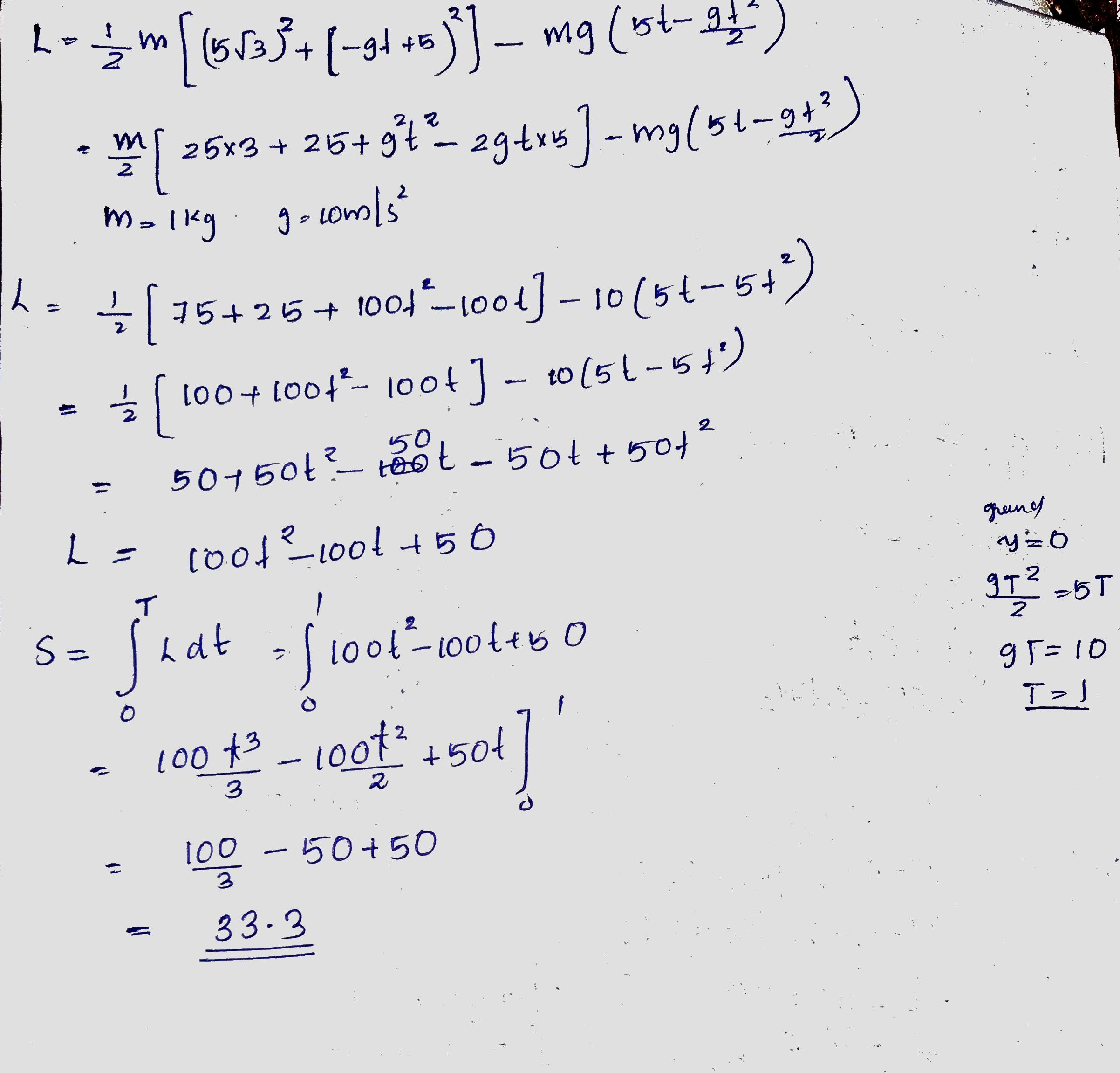 A projectile of mass \(1 kg\) is launched at an angle of \(30^{\circ}\) from the horizontal direction at \(t=0\) and takes time \(T\) before hitting the ground. If its initial speed is \(10 ms^{-1}\), the value of the action integral for the entire flight in the units of kg m^2 s^{-1} (rounded off to one decimal place) is __________