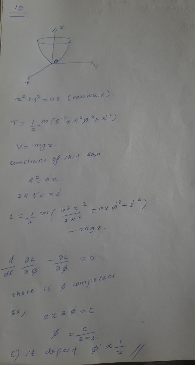 A point mass \(m\), is constrained to move on the inner surface of a paraboloid of revolution \(x^2+y^2=az\) (where \(a>0\) is a constant). When it spirals down the surface, under the influence of gravity (along \(-z\) direction), the angular speed about the \(z\)-axis is proportional to