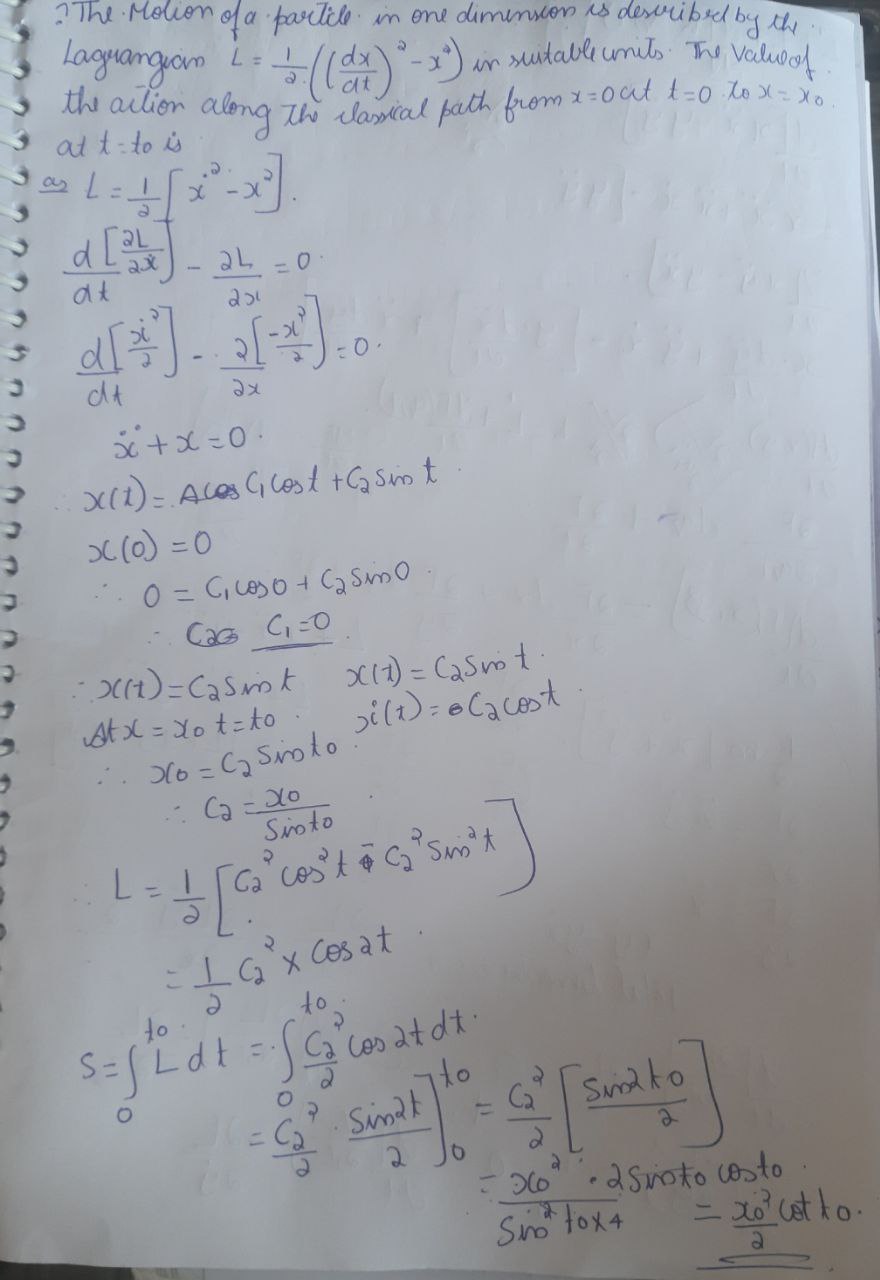 The motion of a particle in one dimension is described by the Lagrangian \(L=\frac{1}{2}\left(\left(\frac{dx}{dt}\right)^2-x^2\right)\) in suitable units. The value of the action along the classical path from \(x=0\) at \(t=0\) to \(x=x_0\) at \(t=t_0\), is
