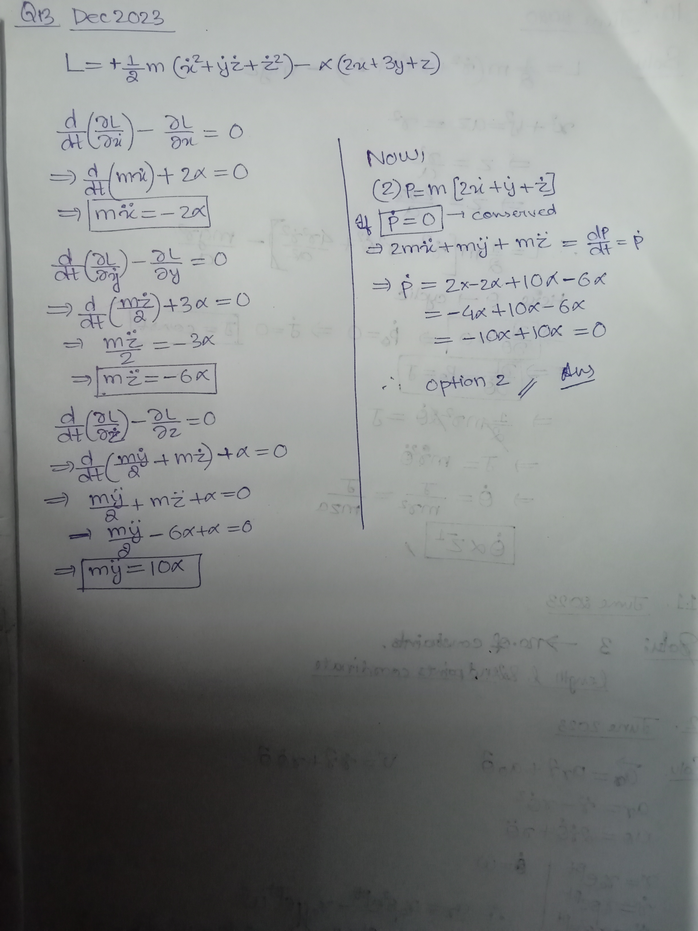 L = \frac{1}{2}m(\dot{x}^2 + \dot{y}\dot{z} + \dot{z}^2) - \alpha(2x + 3y + z).
