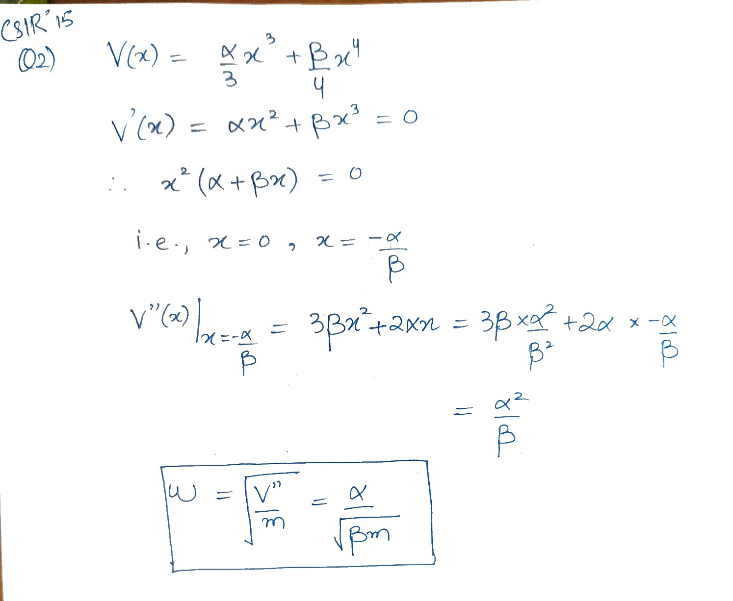 A particle of mass m moves in the one dimensional potential \(V(x) = \frac{\alpha}{3}x^{3} + \frac{\beta}{4}x^{4}\) where \(\alpha, \beta > 0\). One of the equilibrium points is \(x = 0\). The angular frequency of small oscillations about the other equilibrium point is