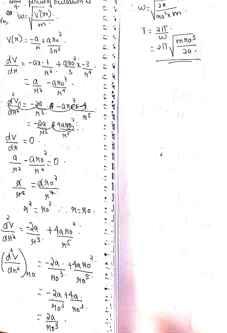 A particle of mass \(m\) is in a potential given by \[ V(r)=-\frac{a}{r}+\frac{ar_0^2}{3r^3}, \] where \(a\) and \(r_0\) are positive constants. When disturbed slightly from its stable equilibrium position, it undergoes a simple harmonic oscillation. The time period of oscillation is