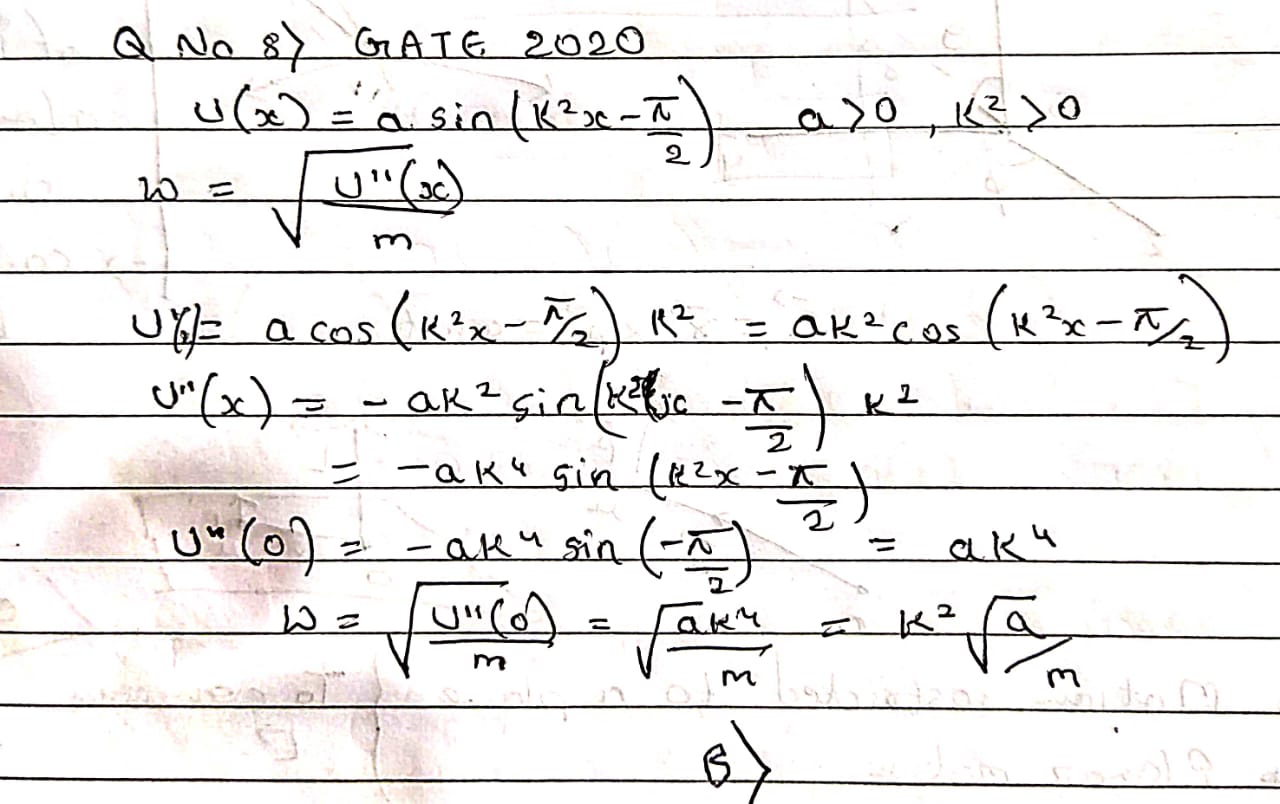 The potential energy of a particle of mass \(m\) is given by \[ U(x)=a\sin{(k^2 x-\pi/2)}, a>0, k^2>0. \] The angular frequency of small oscillations of the particle about \(x=0\) is