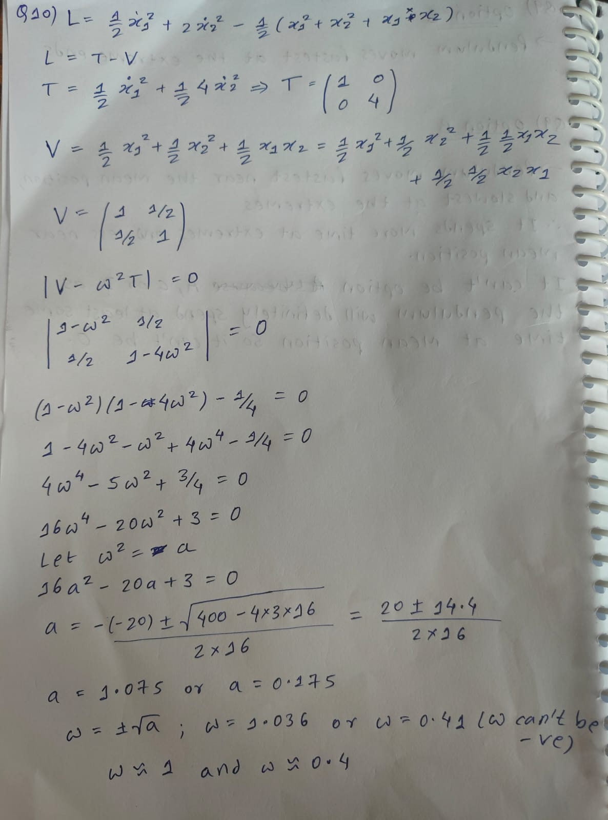The Lagrangian of a system of two particles is \[ L= \frac{1}{2} \dot{x_1}^2 + 2 \dot{x_2}^2 - \frac{1}{2} (x_1^2 + x_2^2 + x_1 x_2)\] The normal frequencies are best approximated by