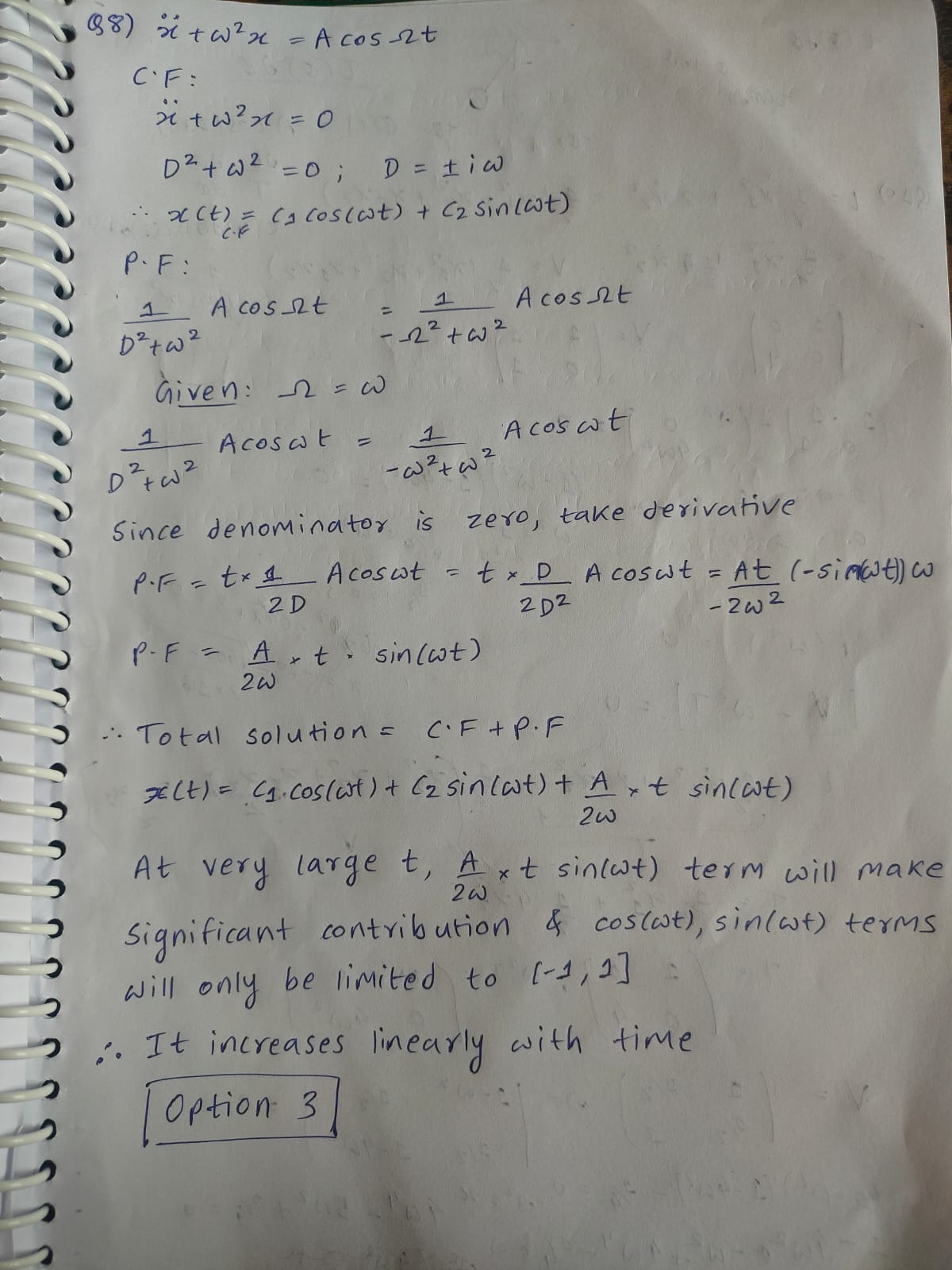 The equation of motion of a forced simple harmonic oscillator is \(\ddot{x}+\omega^2 x=A\cos{\Omega t}\), where \(A\) is a constant. At resonance \(\Omega=\omega\), the amplitude of oscillations at large times